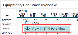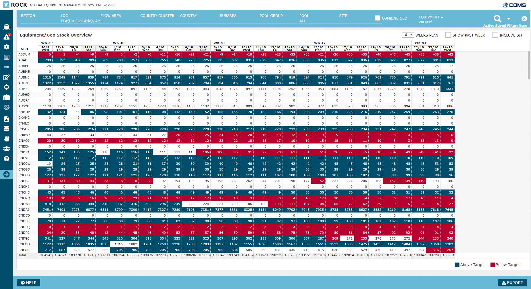 Equipment/Geo Stock Overview is a screen where equ planners can view stock development in multiple geographies for one equipment type or TEU Group at a time. The user can choose to combine stock levels and target sfor multiple geographies. The screen highlights stock levels with colors if it is less than minimum TSL or more than maximum TSL, whenever TSL is available. The user can choose to view stock levels including or excluding SIT level, as per their preference. This screen can be viewed as a version of Positioning Planning Screen showing only one equipment type at a time with less detail per geo and without simulation option. It is designed especially to help users who need to review as many geos as possible at once.