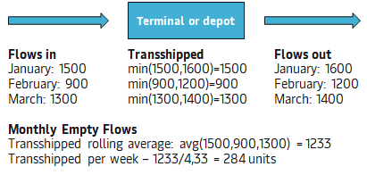 Three months are used to capture - The transshipment are captured as the lowest value of flows in and flows out.