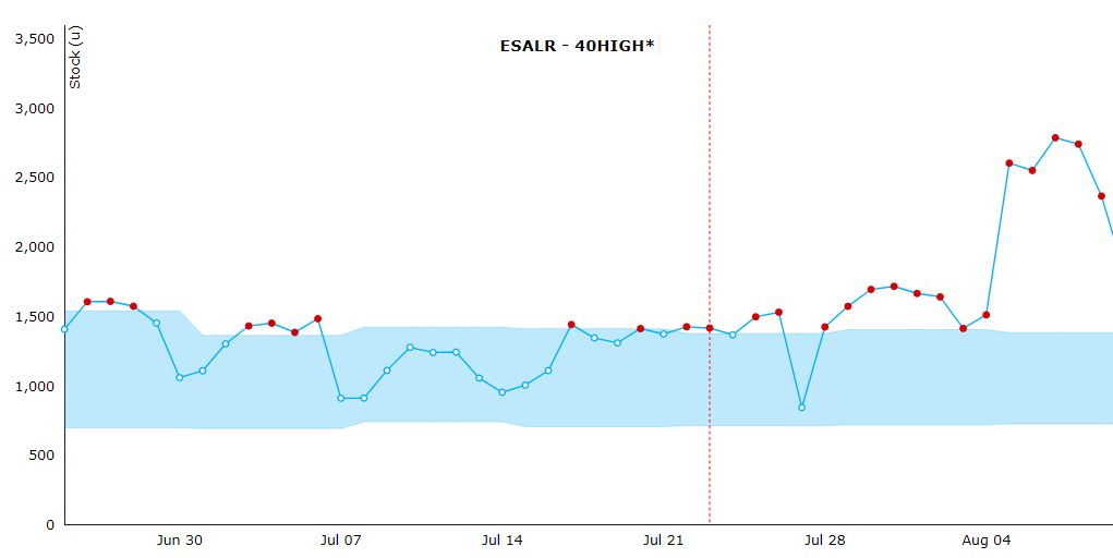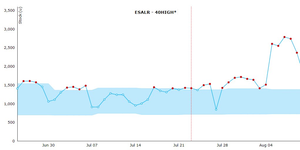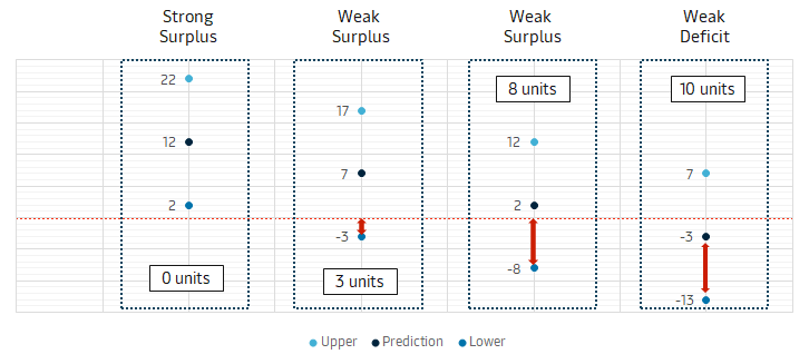 By combining the standard deviation with the prediction, the forecast can be understood as a range rather than just a single number. In the context of using the forecast for setting TSL, the prediction range enables us to set helpful buffers that accounts for likely edge cases in the balance of trade. In general, using a low SD in the formulas to set the target stock level would guide a reduced stock buffer but would also risk a stock-out scenario, where bookings are lost. On the other hand, using a high SD in the formulas to set the target stock level would guide an increased stock buffer to will prevent any stock-out scenario, but at the same time, keeping an unnecessary buffer is costly for the company. The goal is to find a good balance where demand is satisfied and costs are kept low.