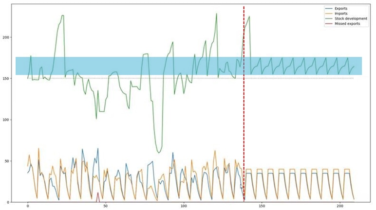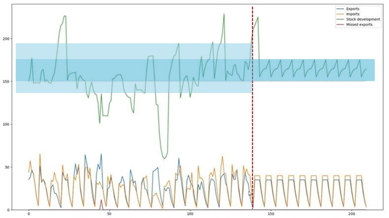 The below figures illustrate a simulation where stock is planned perfectly into the future, but how the volatility of the balance of trade can have a significant impact on the actual stock levels over time (see figure D). When adding a compliance range to evaluate how equipment was planned, the imbalance volatility has less significance when identifying how the target stock levels should be improved (see figure E).