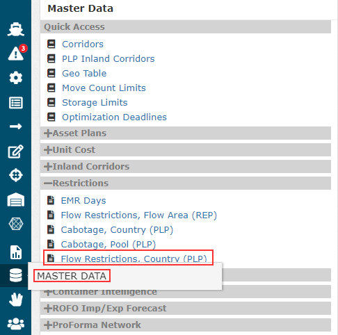 Governments of certain countries apply rules that regulate container flow from/to ports in that country. PLP needs these rules as input, so that it does not suggest empty flows that violate these rules. Such rules in ROCK are maintained in Master Data module. Relevant users can change the excel sheets that contain these rules and re-upload in the designated screen.