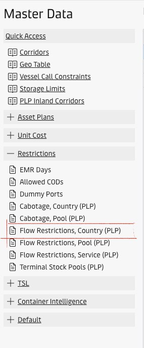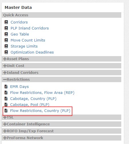 Flow restrictions can be accessed on "Flow Restrictions (PLP)" section on the ROCK Master Data in Master Data module