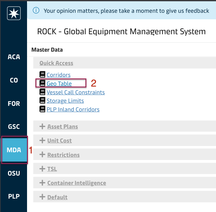 Geo table screen is under Quick Access under Master Data Module: