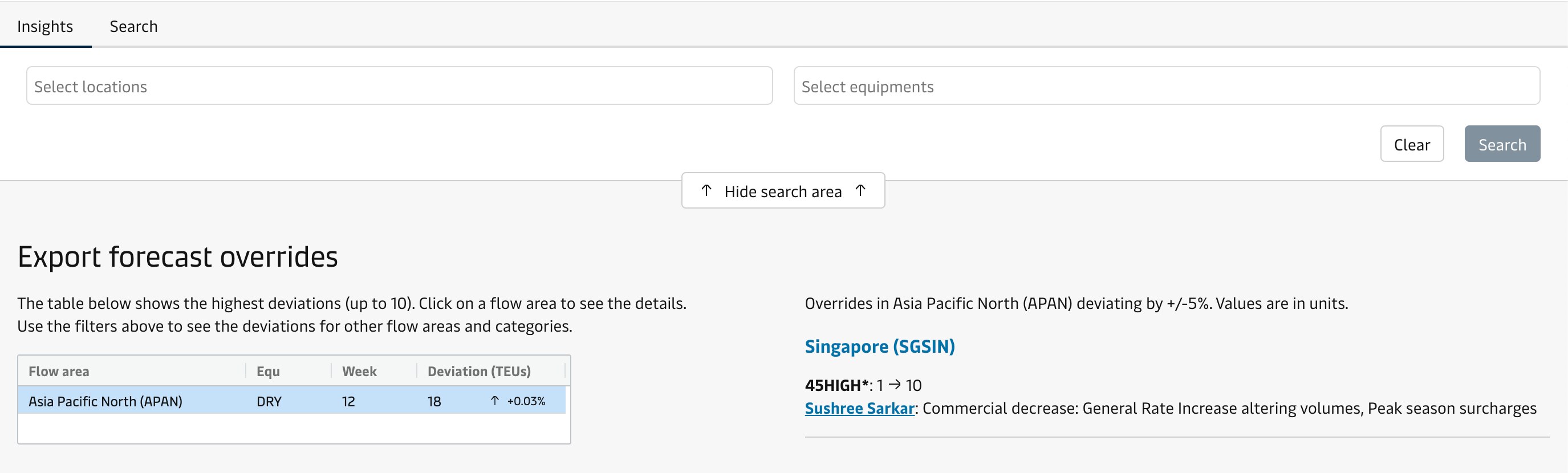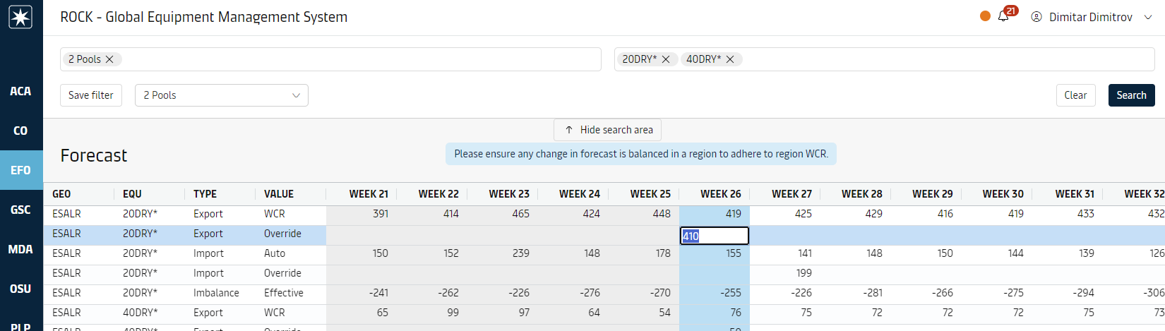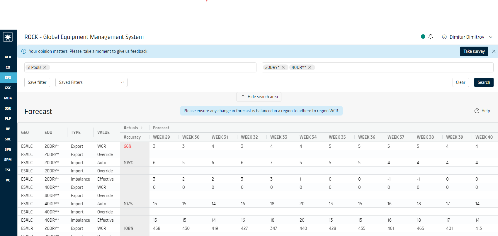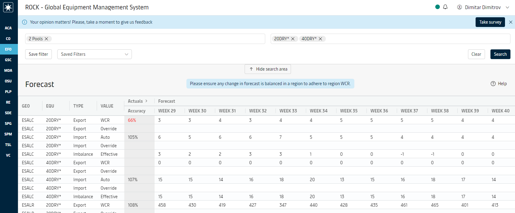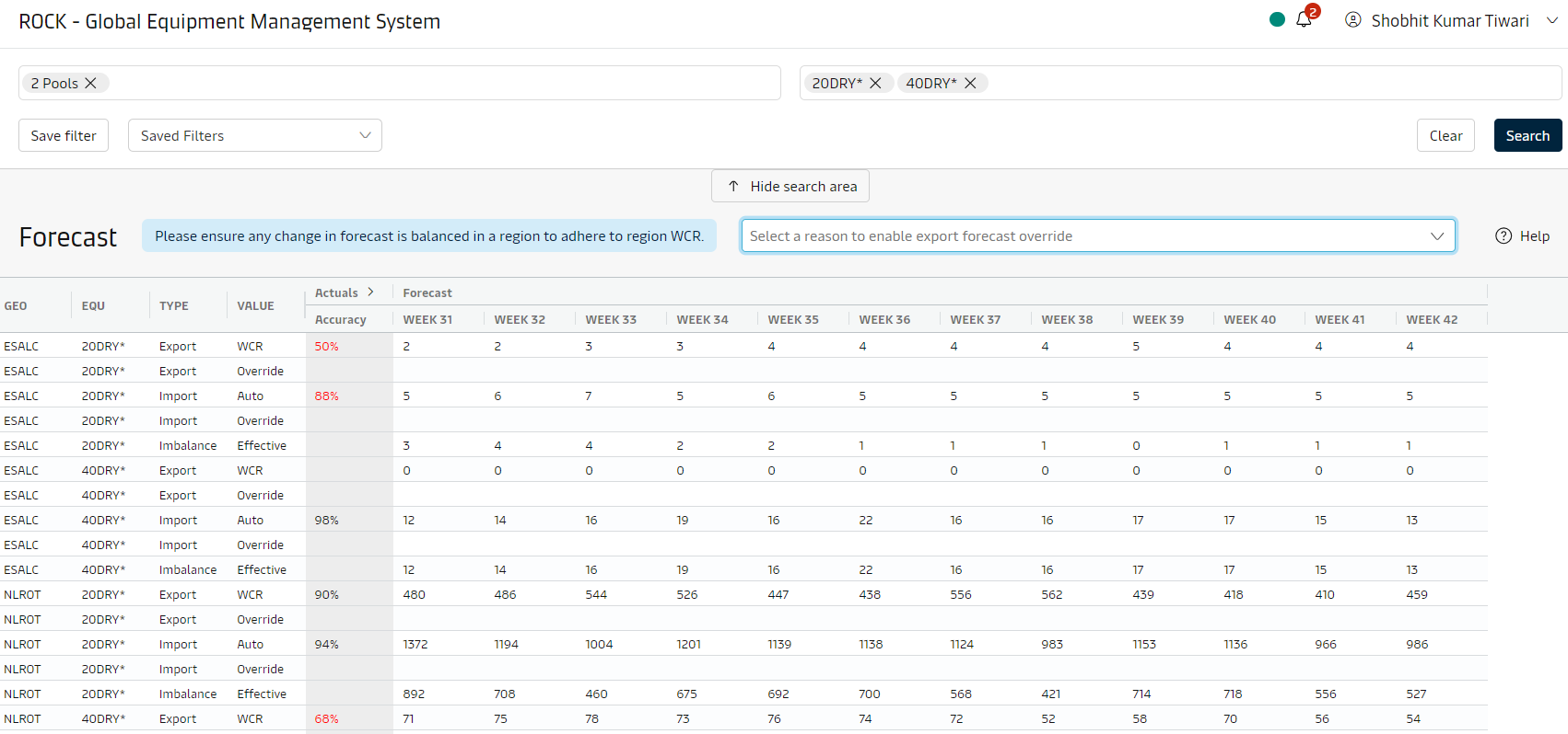 Maersk equipment planning is currently uses autoforecast that has been available by Transported by Maersk for several years. It is based on 5 years of data with proven accuracy (significantly more than 90% on many equipment types and geographical locations) and takes into account factors such as seasonality, holidays, exchange information. It is provided on pool level and ROCK historically has a mechanism to split it further into site level using historical import and export .
