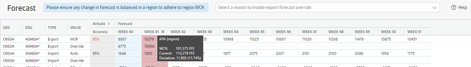 Equipment operators are able to override forecast numbers on pool level after selecting a reason for override using the dropdown menu available above the grid. Once selected the reason applies to all overrides made. User should select appropriate reason if a different reason applies to the value that is being overridden.