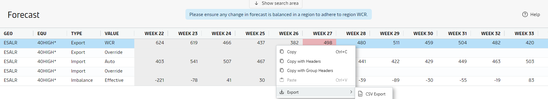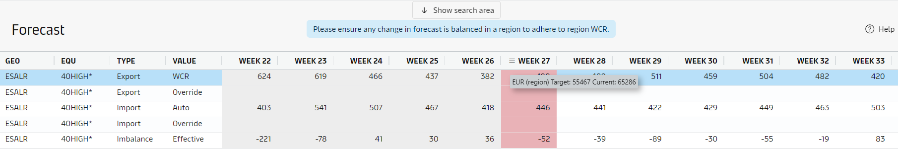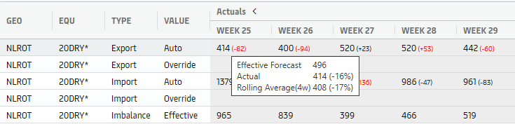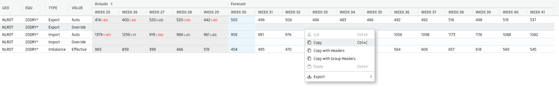 In the grid there are rows for each location-equipment group with data where each row is either about Export, Import or Imbalance. There are also 2 rows each for Export and Import depending on whether it is the original value or a manual override. This applies to the current and future weeks.