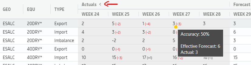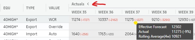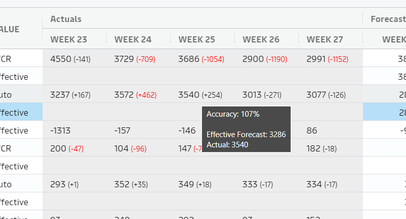 Expanding the column group reveals the weekly data on the actuals including an “Effective forecast (incl. overrides) accuracy” indicator. The format is Actuals (Difference from Effective forecast). If the difference is more than 10%, it is colored in red