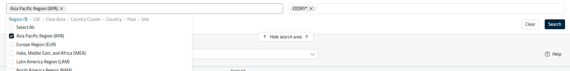 Flow managers require forecast visibility at higher geographical levels, such as country clusters or flow areas. They can utilize the geography filter to view forecasts aggregated at these broader levels