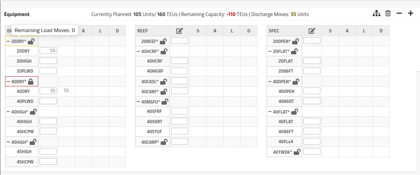 Remaining moves is determined by taking the move limit and subtracting the currently planned empties for all OTTs that are either departing from or arriving at the same terminals, and are on the same vessel.