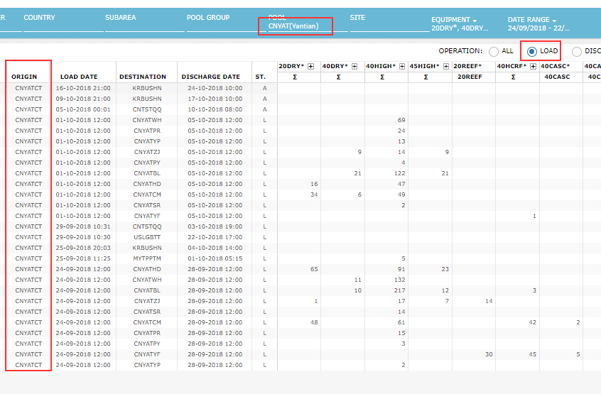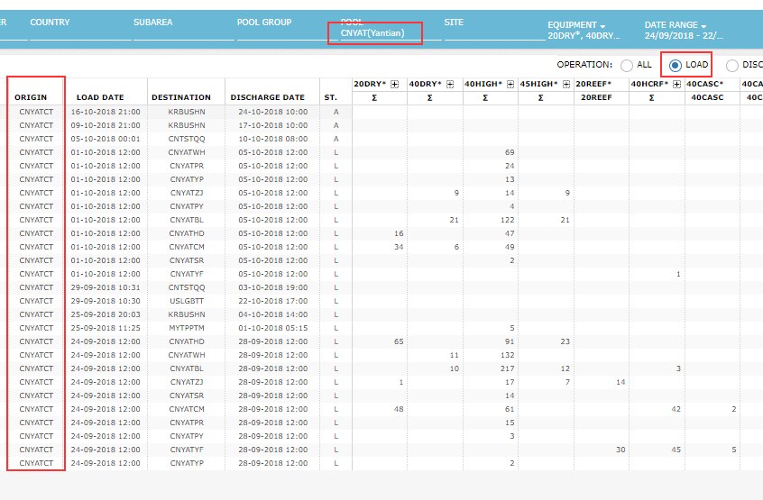 | 11 | Load Date | The Origin Arrival date/time (Origin ETA) as per the schedule selected for the OTT. Origin ETA is considered as the Load Date since this is the date/time where the empty equipment can be assumed out of stock, before Load operations have started, as the vehicle (vessel, truck, rail, etc.) has arrived the origin site. As soon as the system receives Actual Arrival from GSIS, it updates Load Date field with Actual. The field reads "OMIT" if the vessel is omitting the Origin Site. |
