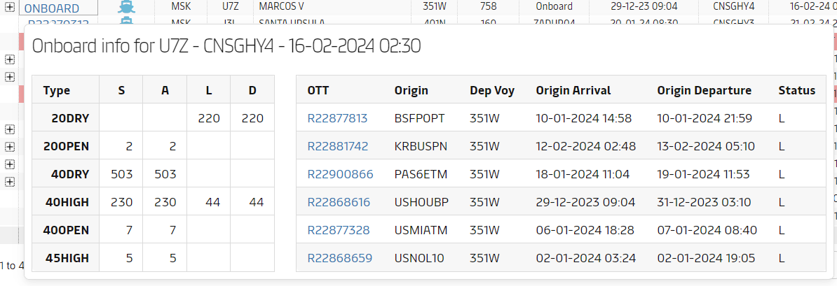 | 25 | Onboard Group | When there are more than one OTTs discharging to the same site on the same call on the same vessel, they might be grouped under a collapsible Onboard row. More information is shown as a popup |