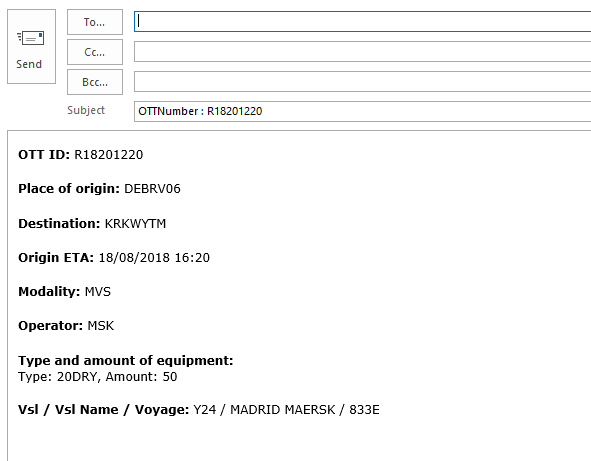 The feature is designed to allow the user to easily summarize the OTT information in an email, in order to send to depots/terminals to orchestrate empty release for loading. When the user clicks here, the system suggests the user to open the file in Outlook application. When the user opens the file, MS Outlook displays a draft email with the following attributes of the OTT pre-populated as seen in the example below: