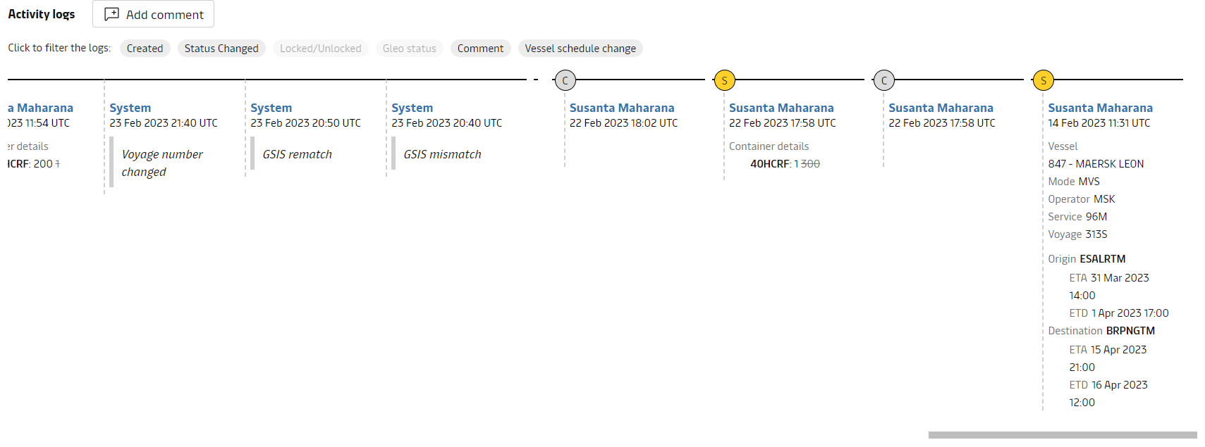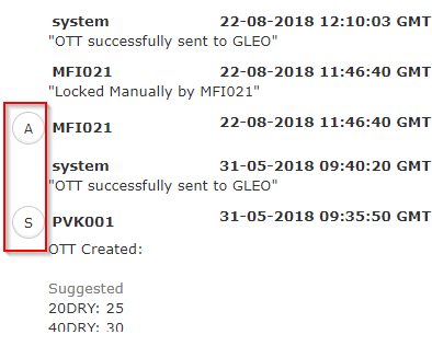 Each OTT log entry includes the actor that has updated the OTT and the time when the update was made. For any automatic update made by the system, the log displays the actor name as "System" or "PLP". The system displays the date/time GMT (UTC) terms. The initial letter of the status in circle is used as a symbol. S, A, L, D, C for Suggested, Approved, Loaded, Discharged and Cancelled statuses, respectively.