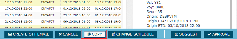 If an OTT is planned on a service with an origin/destination pair that is frequently used, the Copy OTT function will be helpful to make quickly make additional plans for the future. When the users click the Copy OTT function, the schedule is automatically opened, and the user can identify future departures between terminals in the origin and destination.