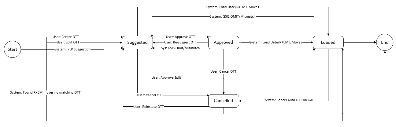 As ROCK is a planning tool to move empty boxes onto ships, there is only two distinct phases i.e. before and after the vessel departs and operations are complete. The OTT states include two states prior to vessel departure, and only one after. The last state Cancelled is reserved for OTTs that are no longer valid.