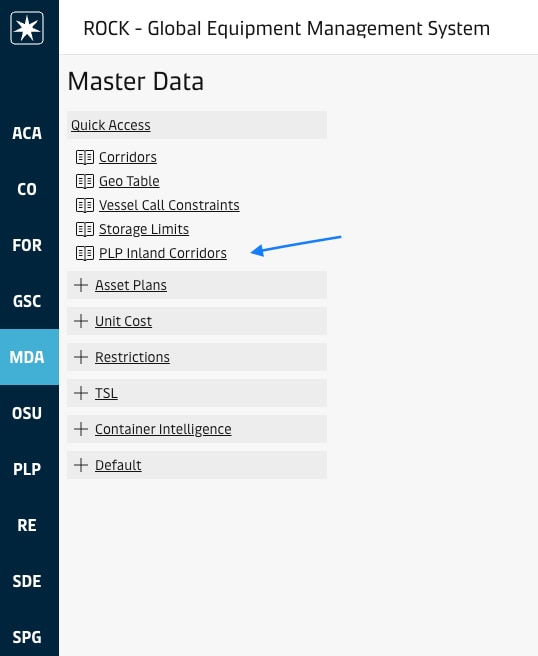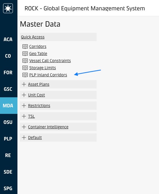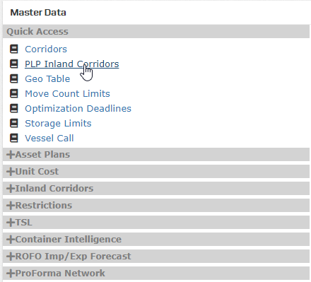 The page is accessible from the sidebar using the "Master Data" entry point. From Master Data landing page, the "PLP Inland Corridors" link can be found in the Quick Acces section. For specific permissions in the site, see Access and Permissions.