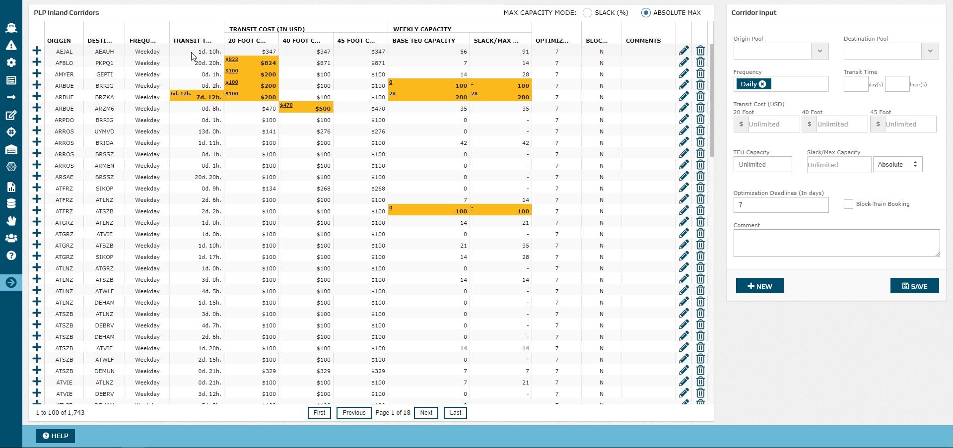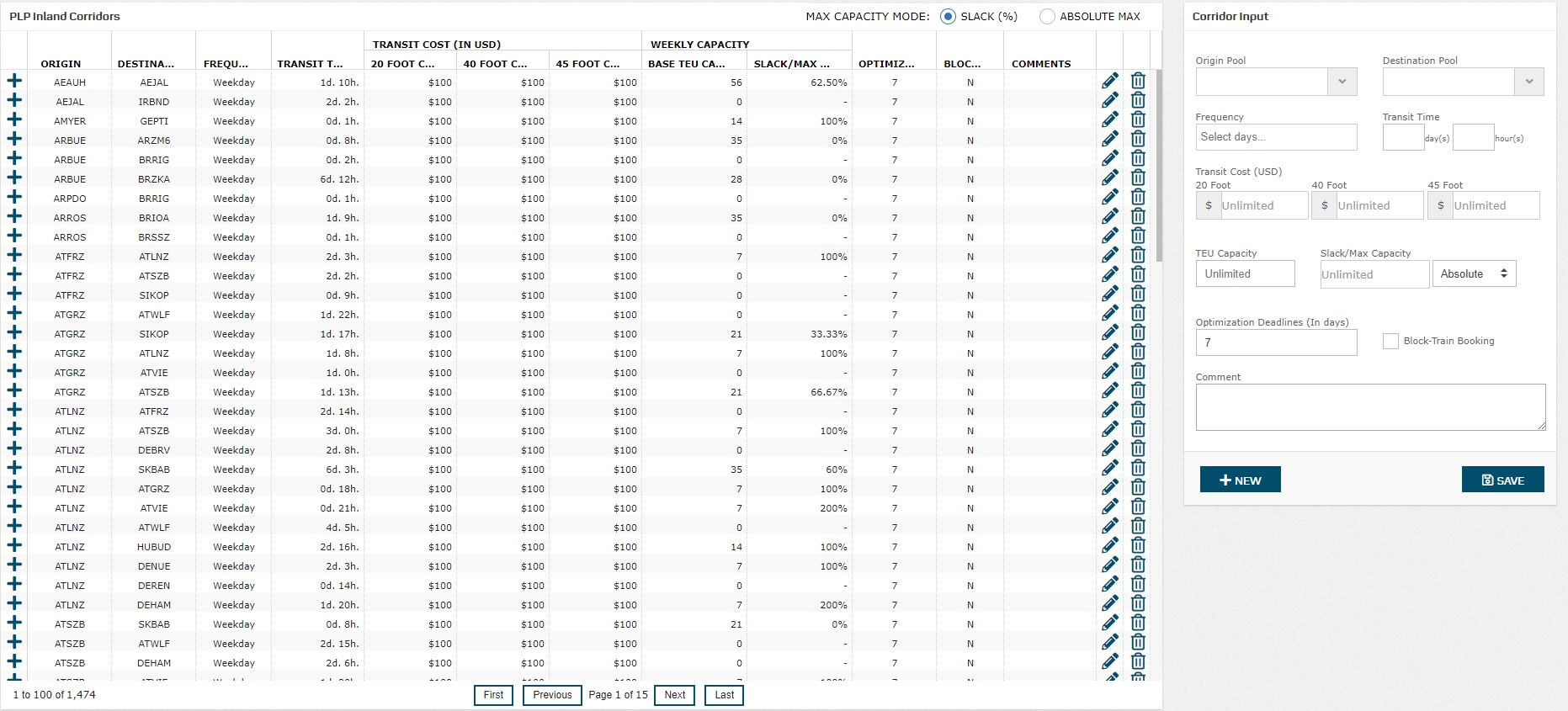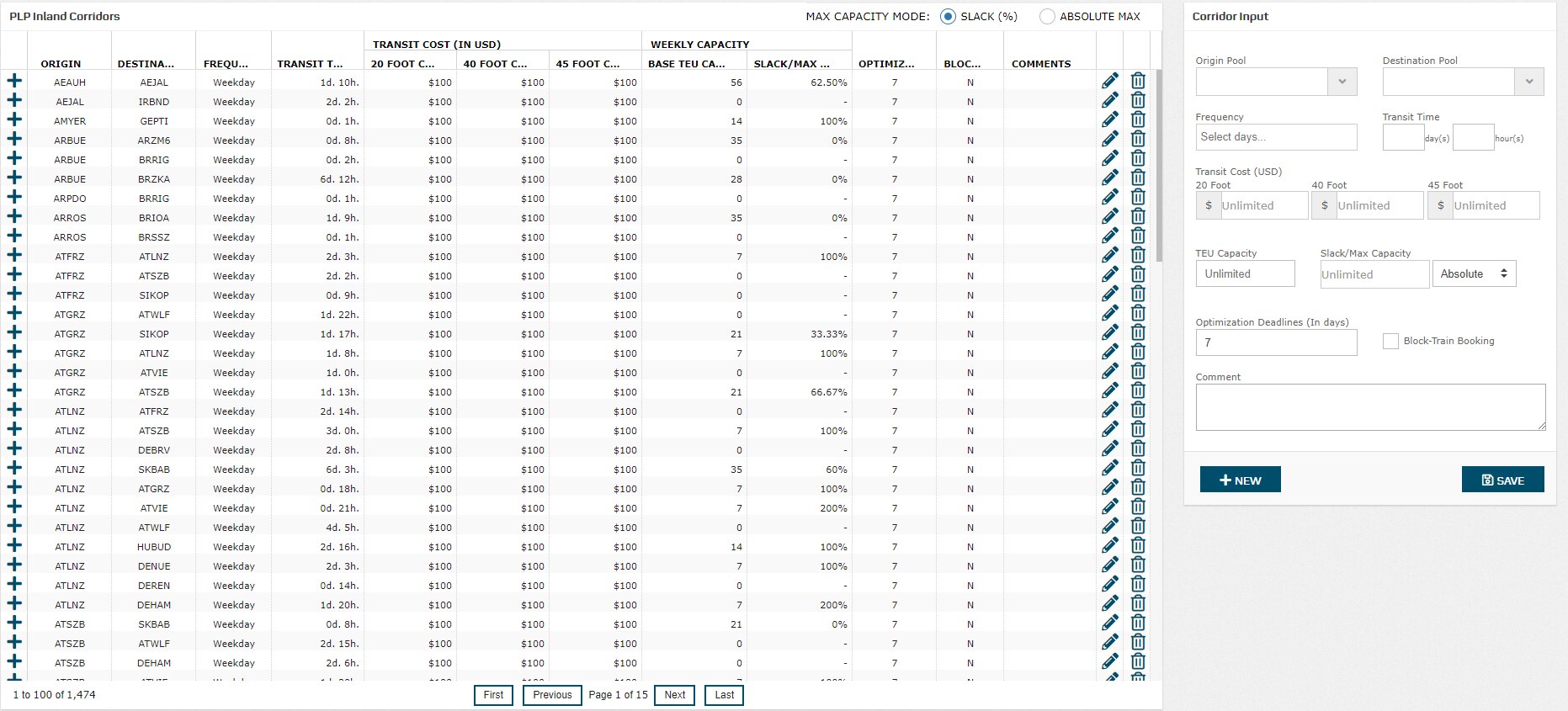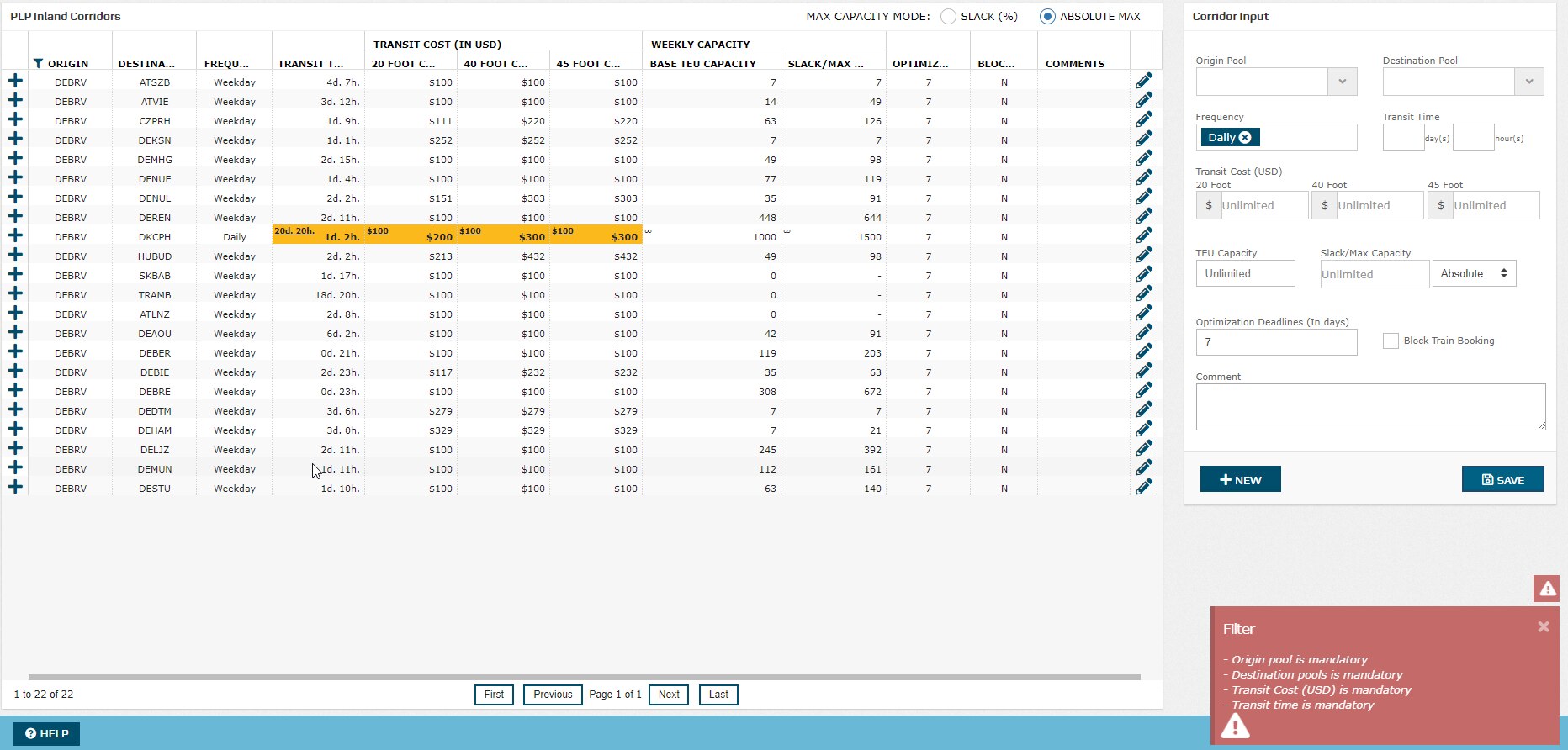 The PLP Inland Corridor screen is a repository of pool-level inland corridors, that are based on historical RKEM moves where either source or destination of the move is inland. The logic to generate and manage pool-level corridors also includes average figures for capacity, frequency, transit-times, and transit cost. The purpose of the screen is to manage these corridors and thus drive how PLP optimiser suggests inland flows in the plan. This includes: