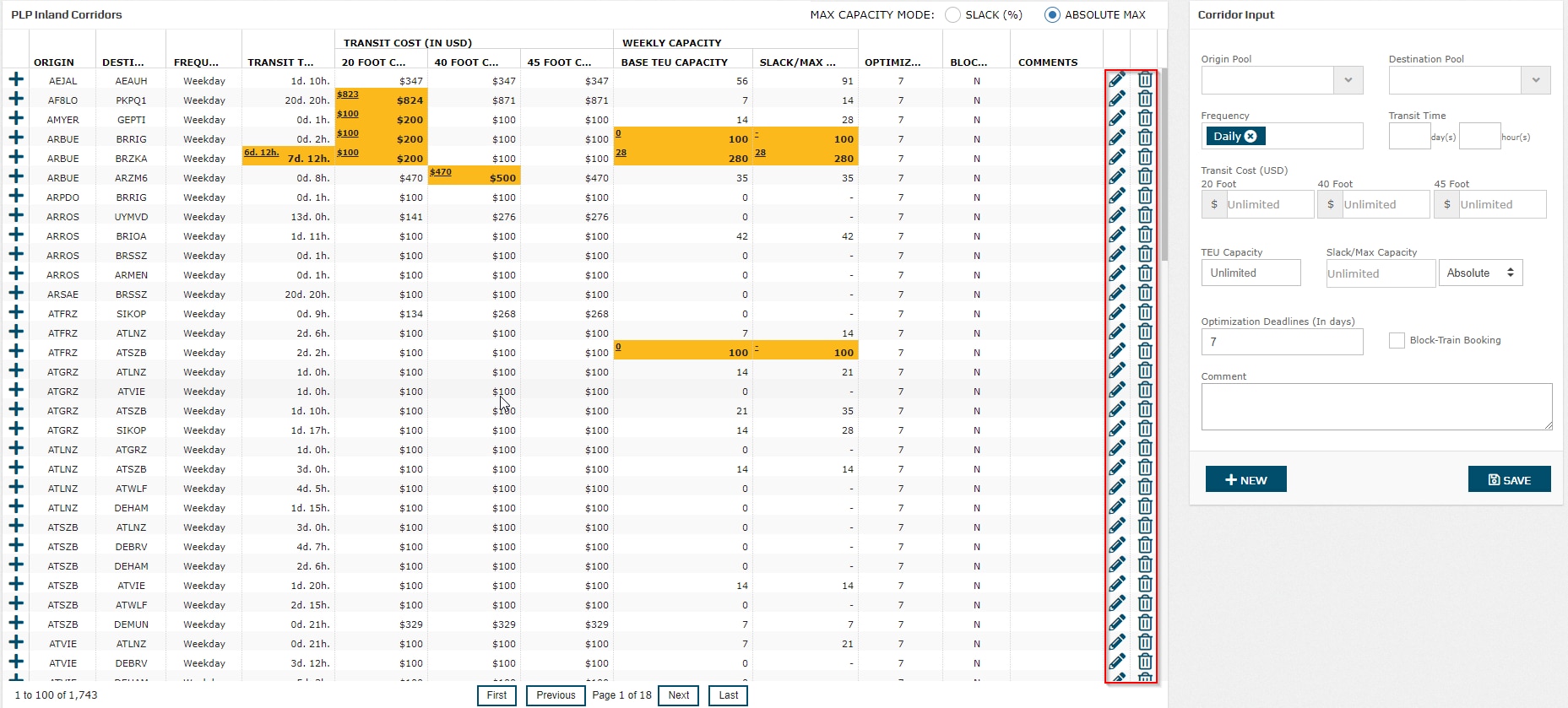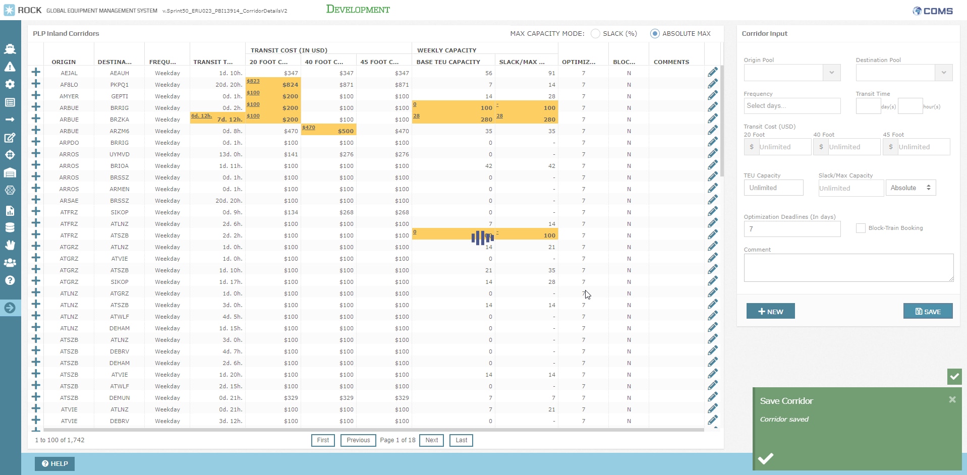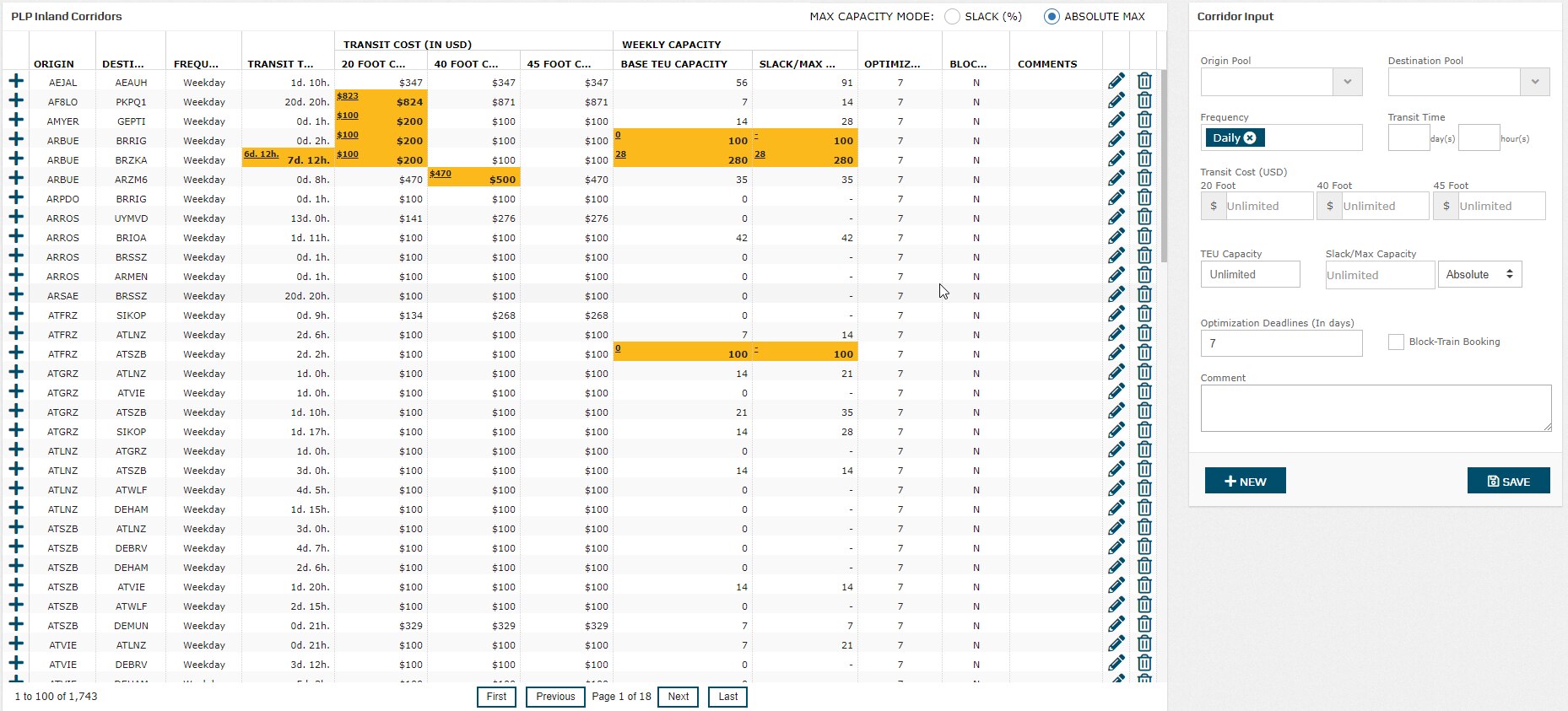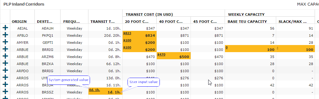 The PLP Inland Corridor screen is a repository of pool-level inland corridors, that are based on historical RKEM moves where either source or destination of the move is inland. The logic to generate and manage pool-level corridors also includes average figures for capacity, frequency, transit-times, and transit cost. The purpose of the screen is to manage these corridors and thus drive how PLP optimiser suggests inland flows in the plan. This includes: