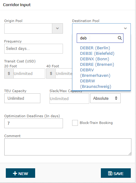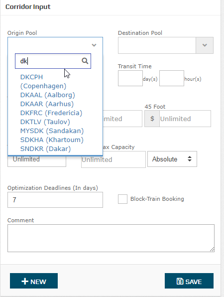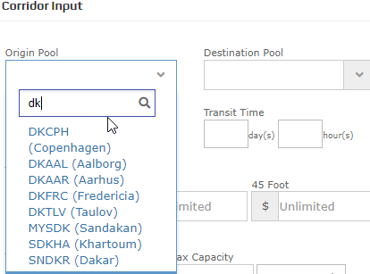 Origin Pool | This input field specifies the origin pool of the corridor. The user can specify the origin pool by typing in the beginning of the pool code. | ||||