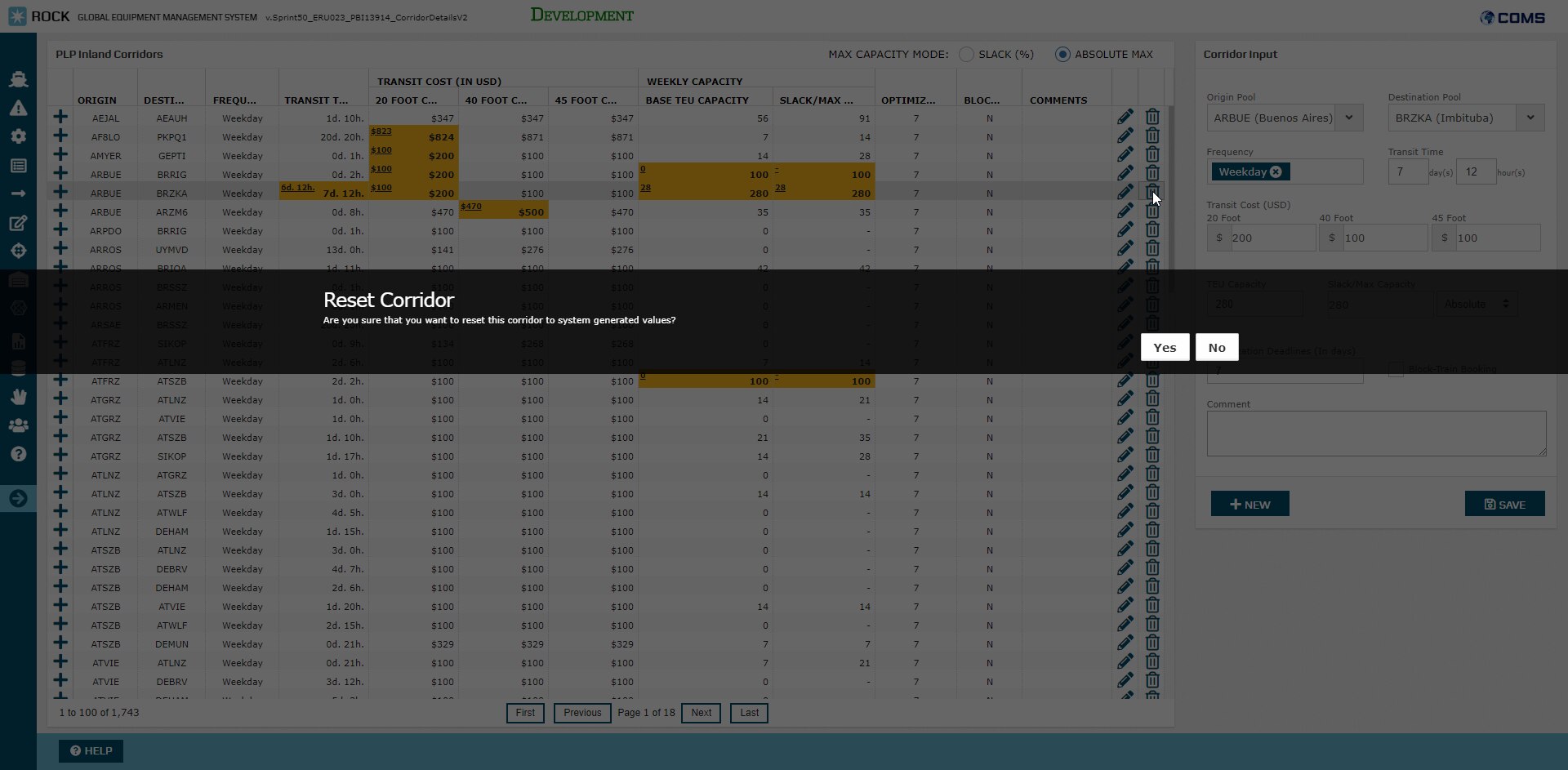 If the user clicks Accept button, the system resets the corridor record. If the user clicks Cancel, the system hides the pop up window and returns the control to the user. When a corridor is resetted, it will remove all user input changes from the screen and show only the system generated values for a corridor.