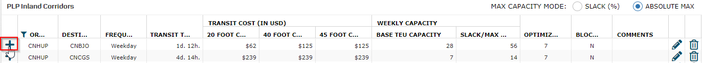 PLP Inland corridor screen shows site level corridors information that are used to aggregate into pool corridor. Site level corridor information for a pool corridor can be seen by clicking '+' icon for a pool corridor row at left of the screen