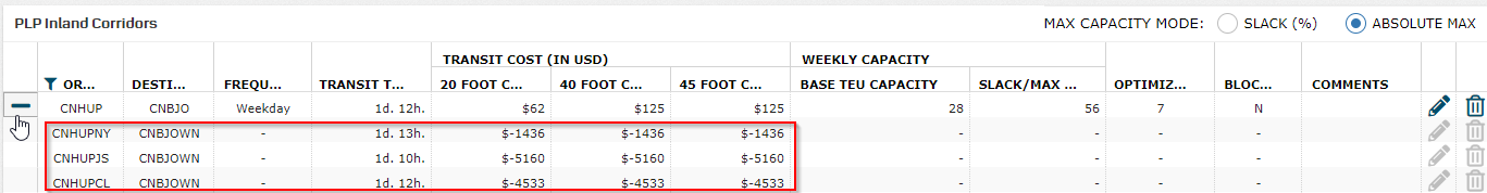 | 3 | Setting Corridor Flexibility View | The capacity flexibility on each of the corridors is specified in the column "Slack / Max TEU Capacity". The flexibility on a corridor means that the PLP optimiser can suggest flows that exceeds the indicated capacity of the corridor, but not greater than the allowed flexibility. However, exceeds the indicated capacity of the corridor will introduce a penalty in the model, to balance the behavior and only exceed when other options are exhausted. The flexibility can be viewed in the grid from two perspectives, using the radio buttons in the top of the grid.