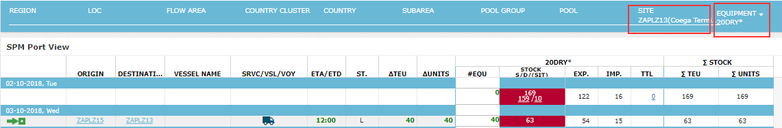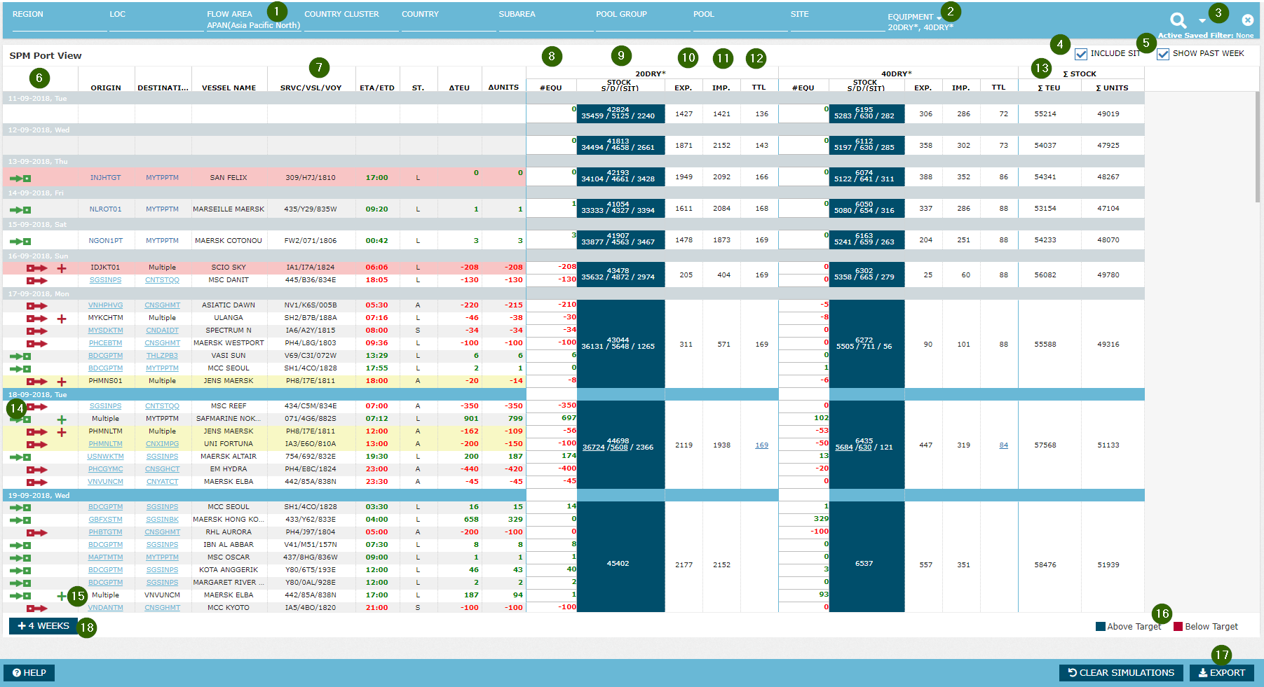 | 2 | Equ Selector | The user can select one or more equipment types or TEU groups. Standard equipment selector features available. See section Using the Global Filter for more details. |