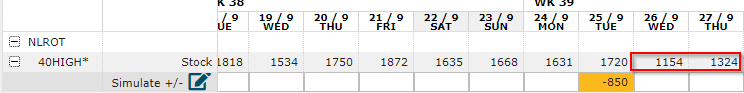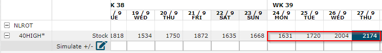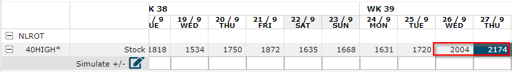 | 9 | Above/Below Target | If the stock level of a certain day is above the maximum TSL for the day, the system sets the stock cell in blue. If the stock level of a certain day is below the minimum TSL for the day, the system sets the stock cell in red. TSL is set at week level (Read more on Target Stock Level) and the system enforces the same TSL for all days of the calendar week. Note that, if there is no TSL data found for a specific geo/equ type/week combination or the stock is between MinTSL and MaxTSL, ROCK does not highlight the cell. |