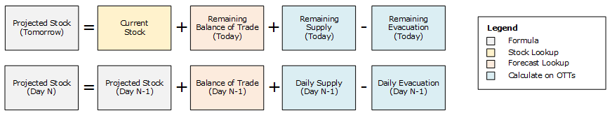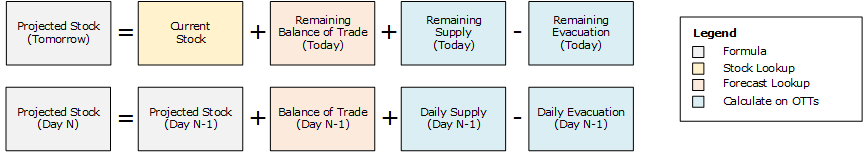 To project stock to a future day N, it is necessary to apply a combination the below formulas, depending on how many days into the future stock is being projected. The first formula projecting the stock of tomorrow must always be used on to determine tomorrows stock, based on remaining operations of today. The second formula must be used on all consecutive days, until the projected stock of day N has been determined. The stock projection formulas are intended to be applied on-the-fly, to consider the all relevant inputs, that are changing constantly.