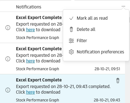 | 1 | Excel export complete | Excel export requested on 01-Nov 13:45 completed. Click here to download |