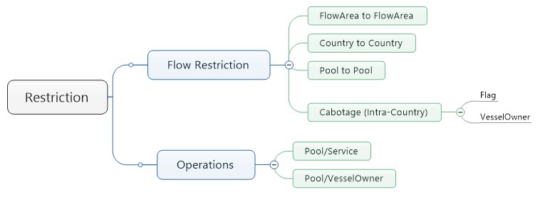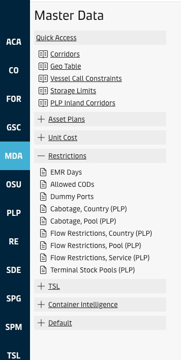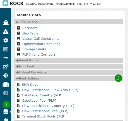The restrictions are managed as general restrictions and specific cases. The general restrictions restrict empty flow combinations that are common across regions, while specific cases restrict behaviour limited to very specific to countries and/or services. The general restrictions are managed as individual reference data in ROCK master data, while the specific cases are enabled/disabled in the scenario parameters reference data. All files are accessible in the ROCK Master Data screen in ROCK.
