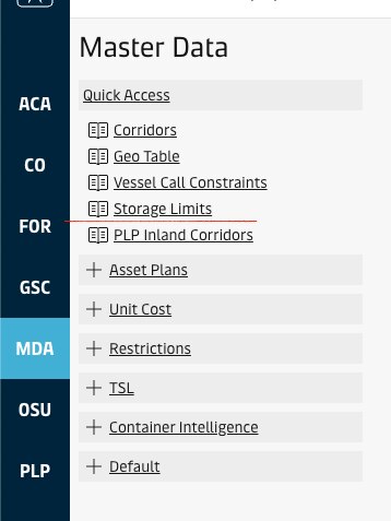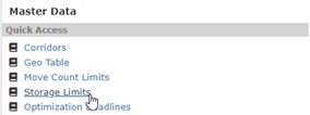The page is accessible from the sidebar using the "Master Data" entry point. From Master Data landing page, the "Storage Limits" link can be found in the Quick Acces section. For specific permissions in the site, see User Roles & Permissions.