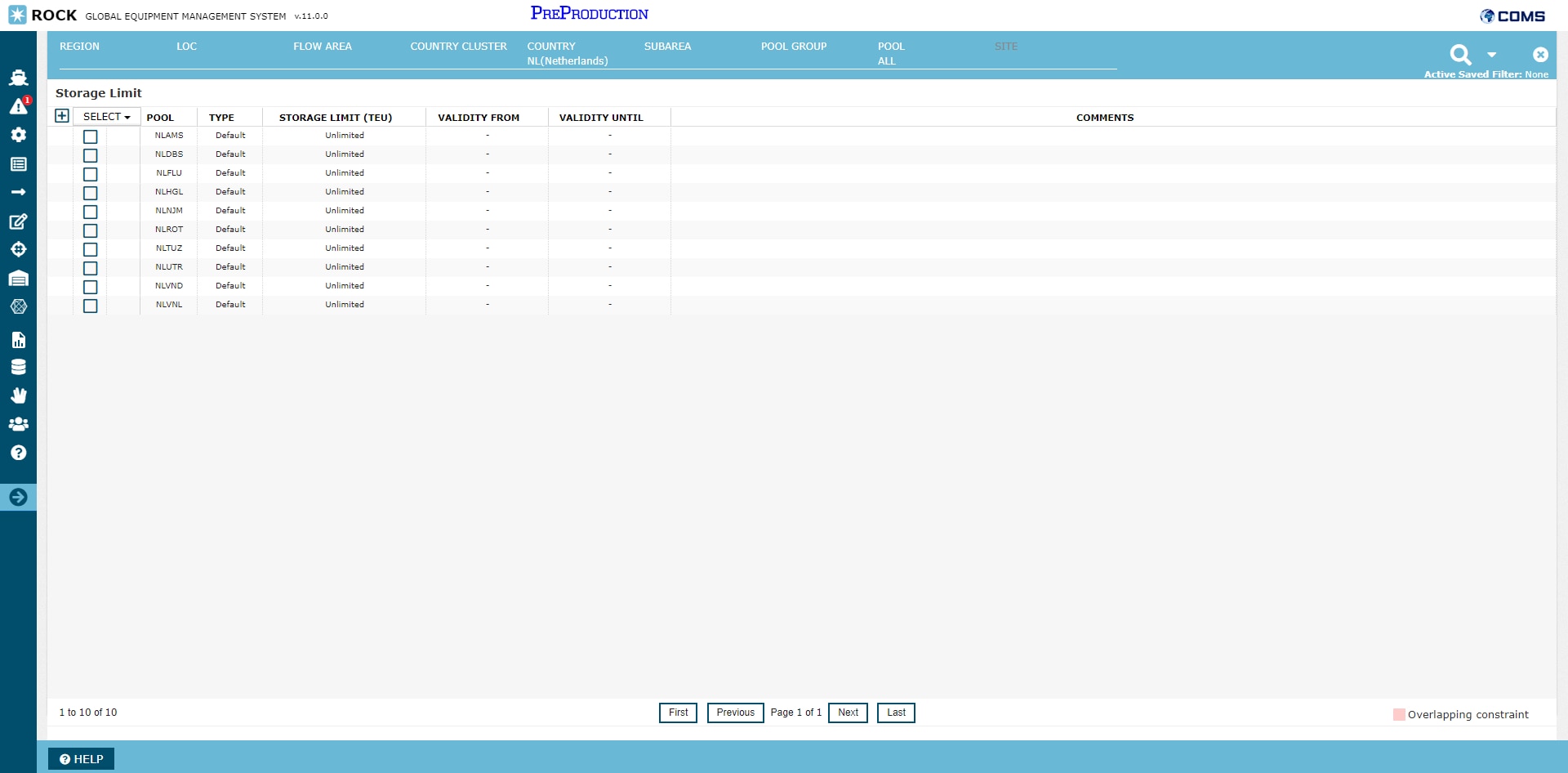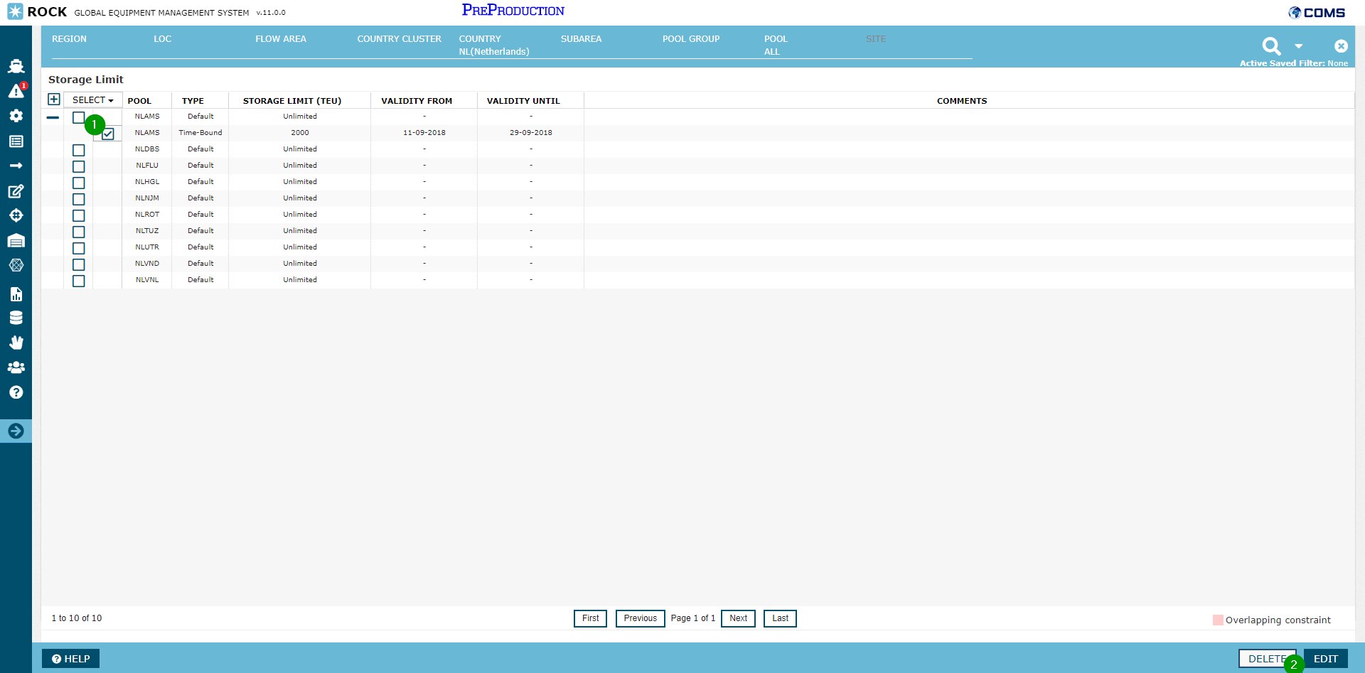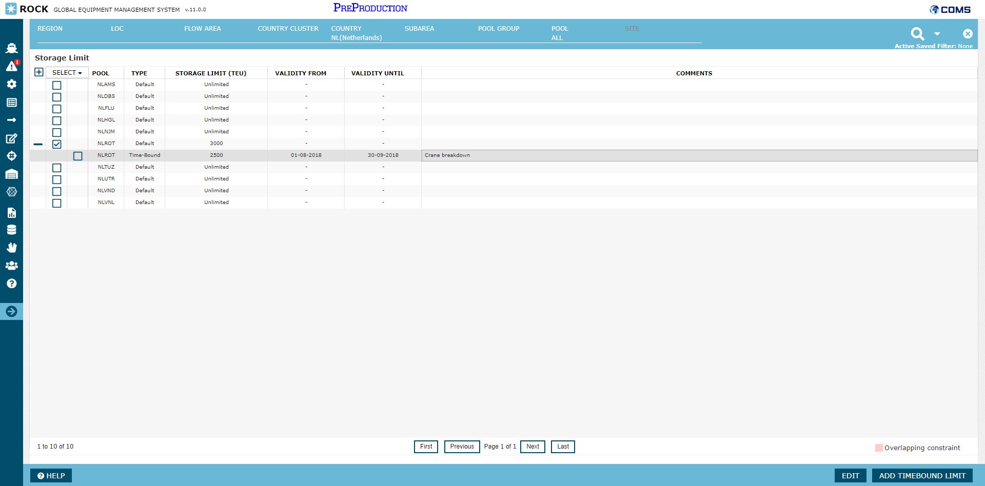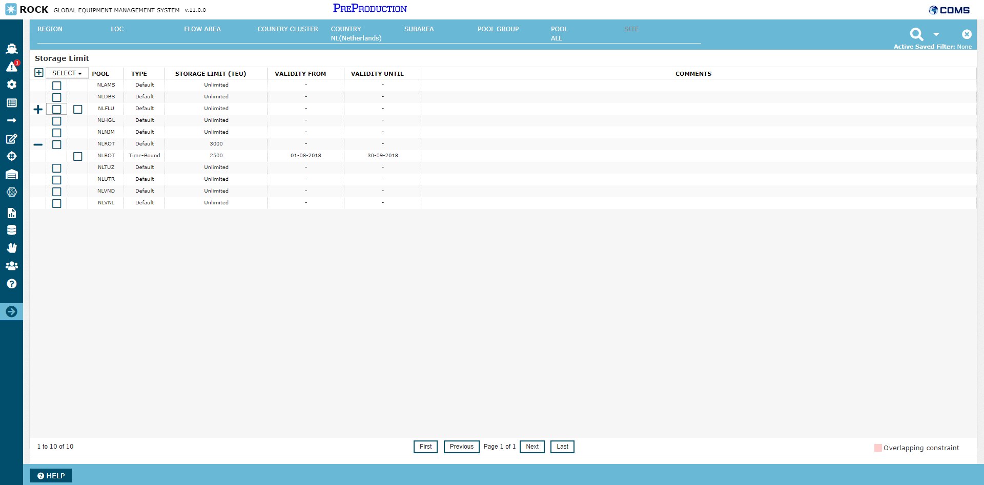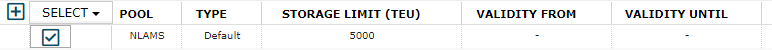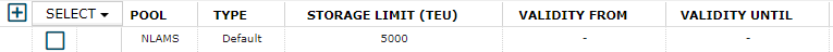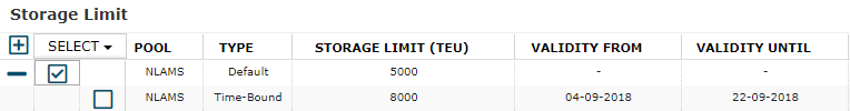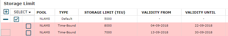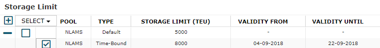 In the layout of the grid, each pool is represented as a row of type "Default". This row represents the default storage limit constraint for the pool that the optimizer will use, unless a valid "time-bound" storage limit constraint is provided. Timebound storage limit constraints can be provided in the screen as a child row to the default constraint. In the above example, the default storage limit constraint for NLROT is 3000 TEU, but a time-bound constraint has been added from 1st of august 2018 to 30th of september 2018. During this period the optimizer will optimize empty flows to respect a storage limit of 2500, instead of 3000.
