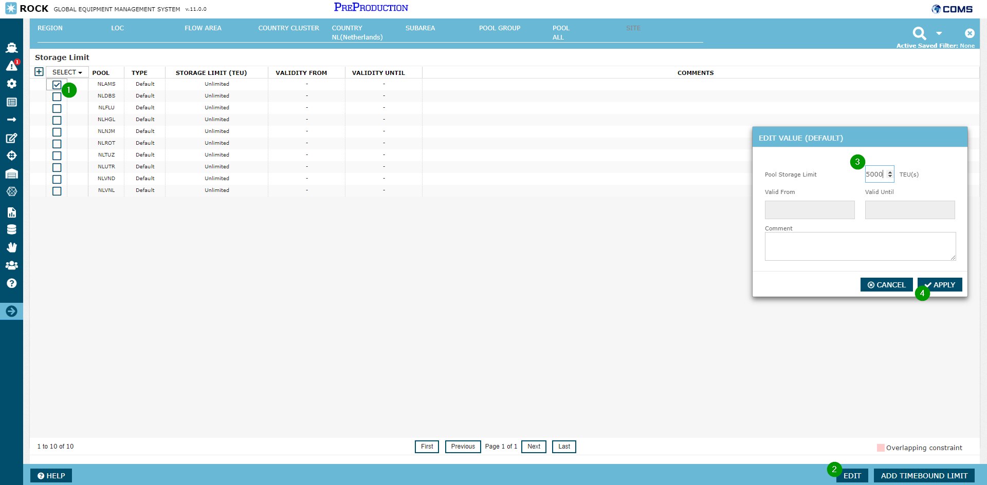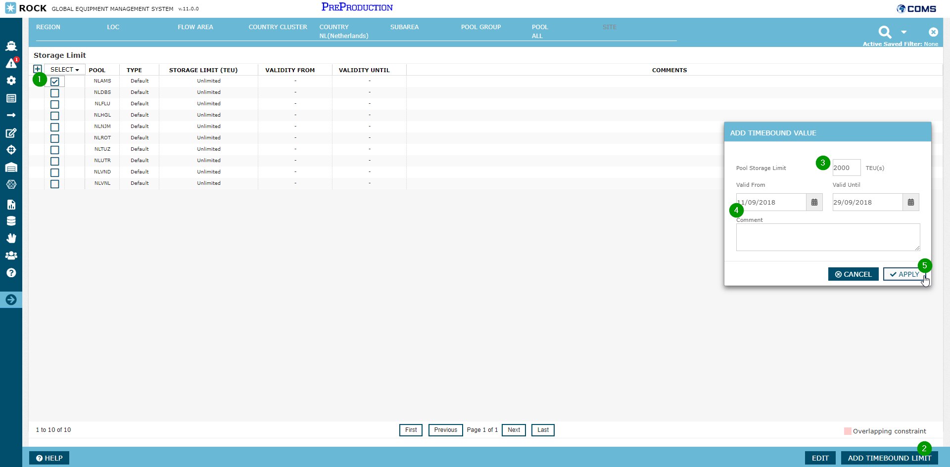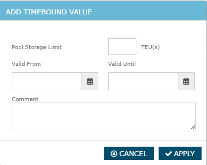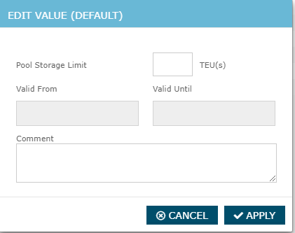 Step 3: From the pop-up window, the Pool Storage Limit can be entered in TEU(s) with an optional comment.