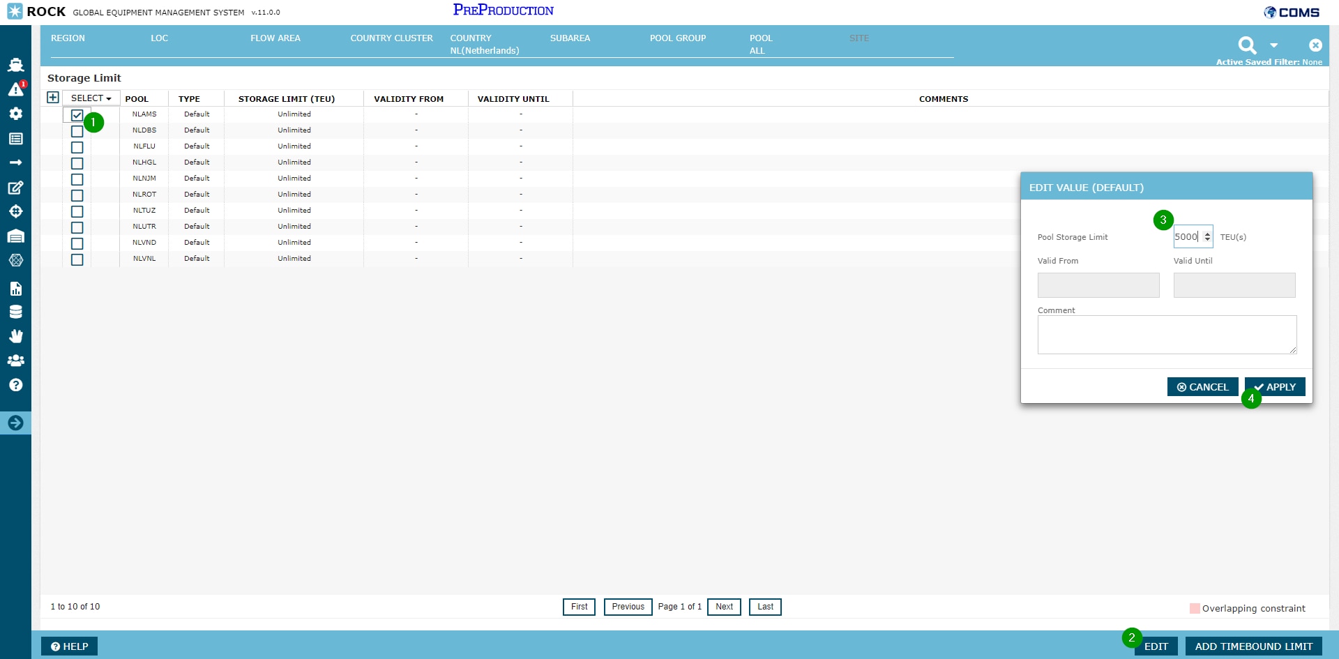 Step 3: From the pop-up window, the Pool Storage Limit should be specified in TEU(s),
