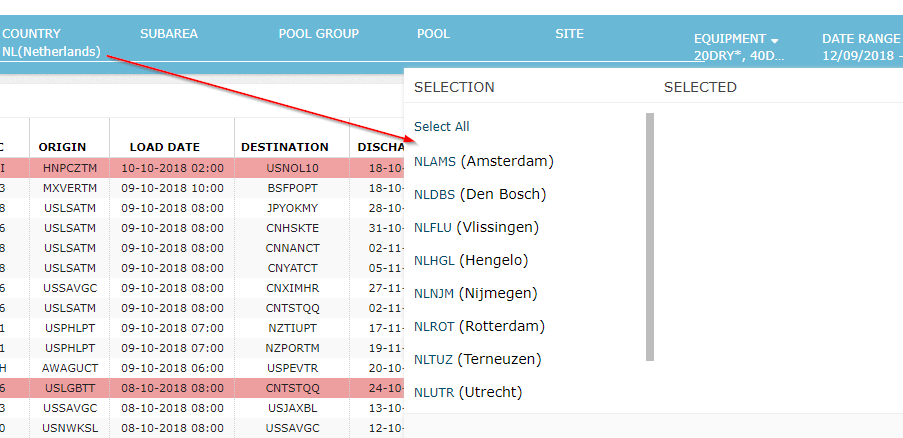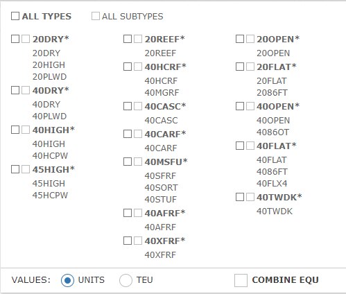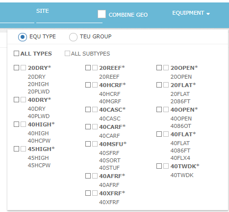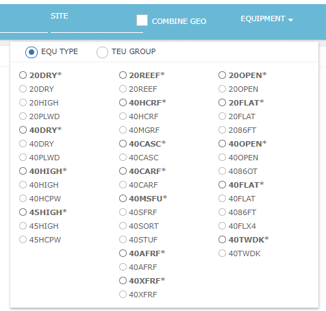 Some screens feature the old style Equipment Selector, which includes TEU group selection. Below example is from Positioning Planning Screen. This design is to be obsolete soon; the ambition is to roll out the flexible selector (the first one above) to all ROCK screens with Global Filter. The advantage of the flexible selector over the one below is that, it centralizes all the equipment-related selections into the same control and allows easy aggregation of data from several equ types in Units or TEU, removing the need to build separate controls for this screen by screen.