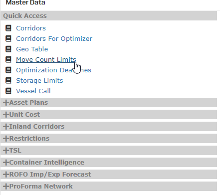 The page is accessible from the sidebar using the "Master Data" entry point. From Master Data landing page, the "Move Count Limits" link can be found in the Quick Access section. For specific permissions in the site, see User Roles & Permissions.