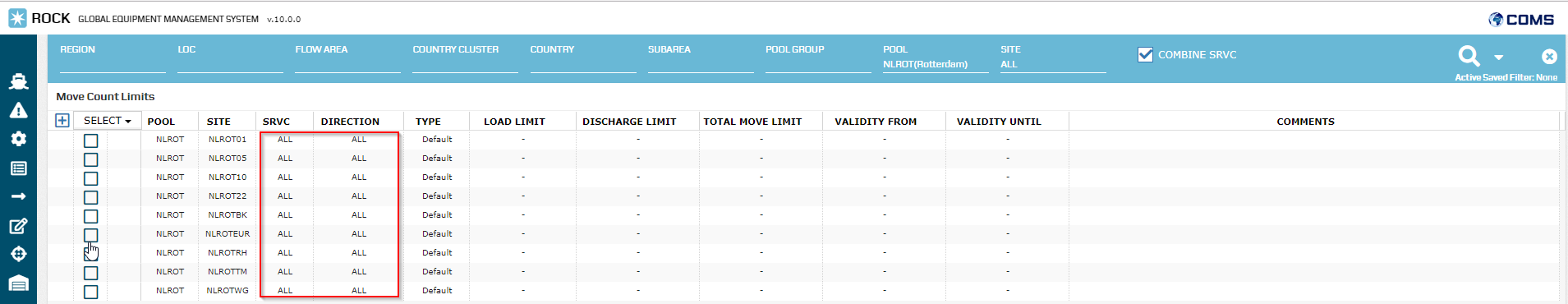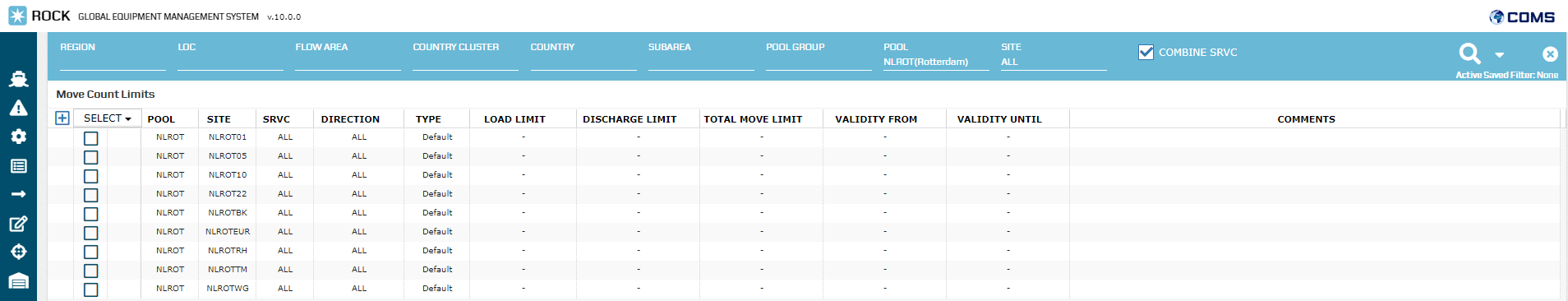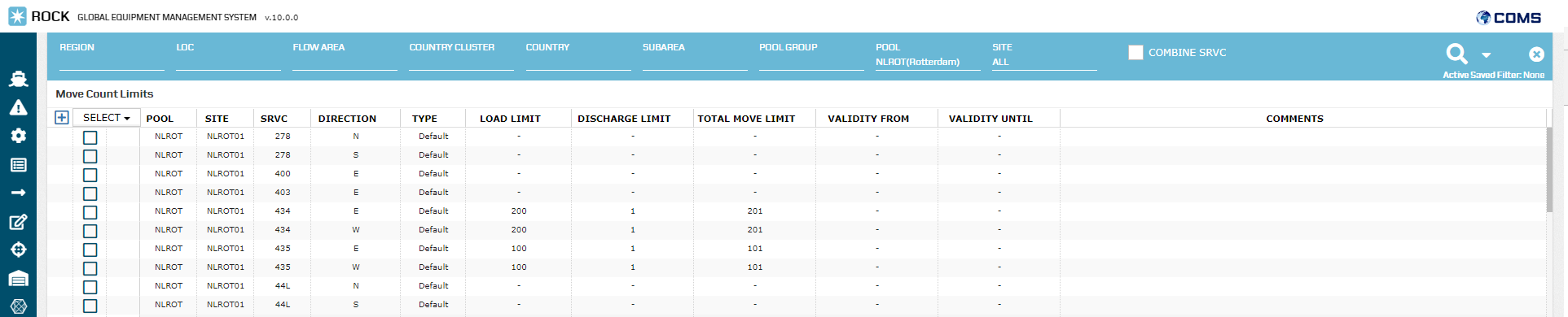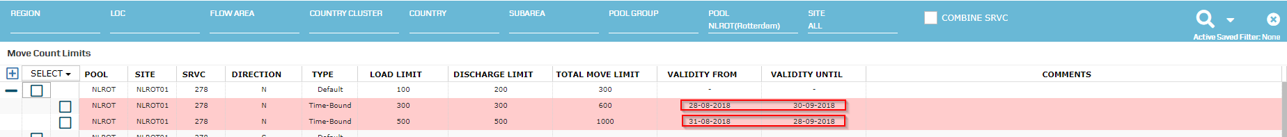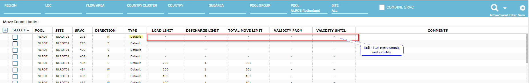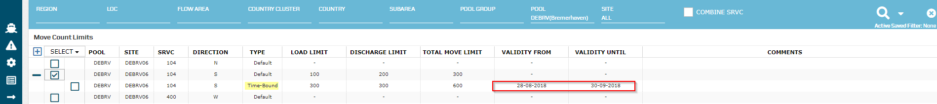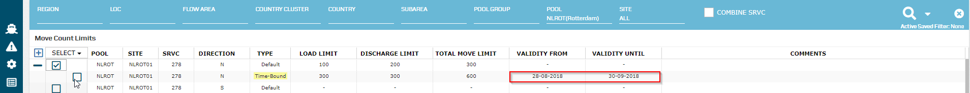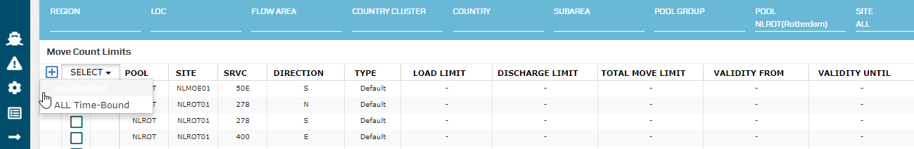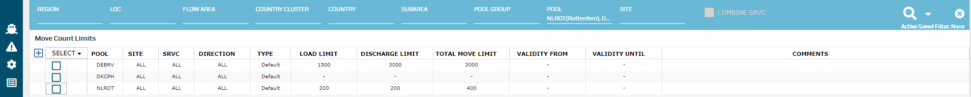 The purpose of the Move Count Limits library is to drive number of allowed load and discharge move counts for each future vessel call planned by the PLP optimiser. These move counts constraints are used as input in the solver and the flow plan is plan is generated to respect the move count accordingly. Move Count constraints can be applied to each vessel call combination available from relevant GSIS (service/terminal/direction). The screen dictates the default Move Count Limits to be used, but can be overwritten in the screen to manage specific vessel calls, i.e. the "Vessel Call" screen.