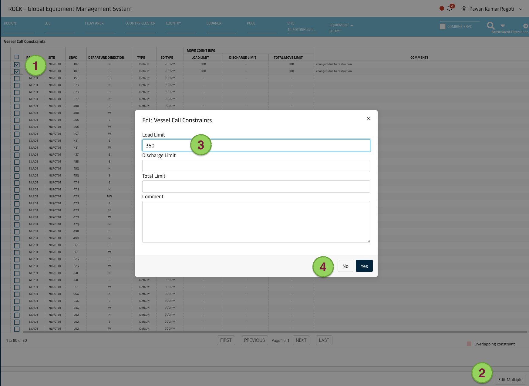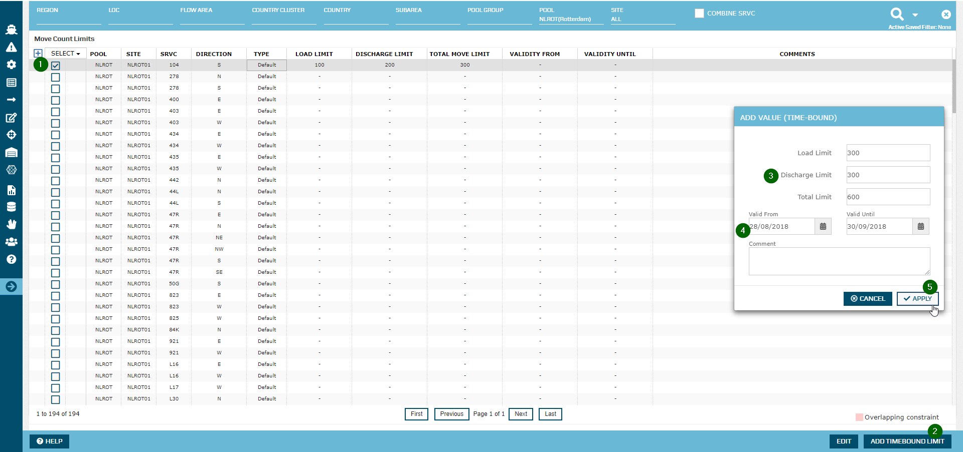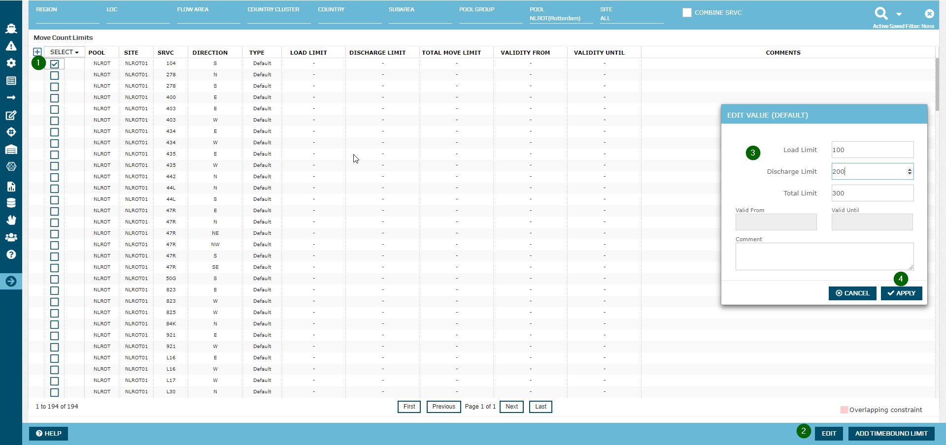 Select a row or multiple rows using checkbox where user wants to add or update move limits.